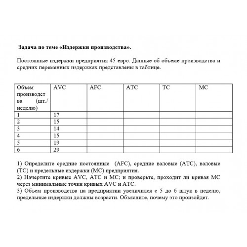 Постоянные издержки предприятия 45 евро. Данные об объеме производства и средних переменных издержках представлены в таблице.