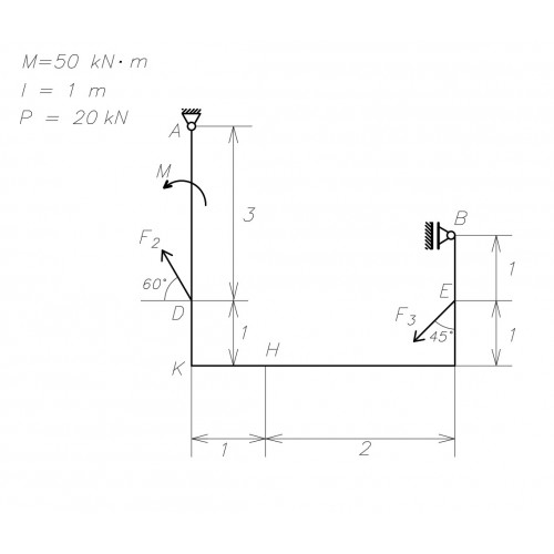 Uz homogēnu rāmi, kura viena metra garuma svars vienāds ar 20 kN, darbojas divi spēki F (no četriem: F1 F2 F3 F4, skat. S.1. tabulā atkarīgi no varianta) un spēkpāris ar momentu M = 50 kNm; l = 1m.