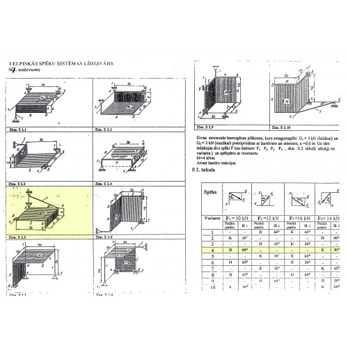 Divas savienotās homogēnas plāksnes, kuru smagumspēki G1 = 5 kN (lielākai) un G2 = 3 kN (mazākai) piestiprinātas ar šarnīriem un stieņiem, a = 0,6 m. Uz tām iedarbojas divi spēki F (no četriem: F1 F2 F3 F4 , skat. S.2. tabulā atkarīgi no varianta) un spēkpāris ar momentu M = 4 kNm.